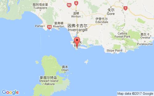 | 港口介绍 | [布拉夫港口位置如地图所示。, 布拉夫(bluff)地理经度:168.3457088,纬度:-46.5996116。新西兰线航线主要港口之一, 新西兰商港。位于该国南岛西南端布拉夫湾内,临福沃海峡。东北距奥塔戈港150海里。利特尔顿港315海里,惠灵顿港460海里,至悉尼港1105海里。该港实是因弗卡吉尔市的外港,相距约20公里。港区分布在布拉夫湾的西北岸,自西北至东南有:港岛码头,处在城镇北岸外的一个小岛东北岸,有海堤与陆岸相连。该港区有9个泊位,分布在突堤沿岸与顺岸,泊位编号自东南至西北,码头线总长1606米,沿岸水深8-10米,其中1和6号泊位用于装卸集装箱、滚装船;2号泊位用于装卸散粮。码头上有6600吨谷仓。装卸机能力为500吨/小时,3A、3-4号泊位用于装卸石油,码头上油罐容量4775吨;7号泊位用于装卸冷冻货;8号泊位用于装卸木屑。 城镇码头,处在城镇东北,为一“T”突堤,顶端3个泊位,总长550米,前沿水深8.3-10米,用于装卸石油、化肥、沥青、硫磺等;该突堤东岸东伸突堤为轮渡码头,长200米,水深7米;西部陆岸与港岛之间是渔港突堤。TIWAL码头,在港湾东岸TIWAL角之北,由炼铝厂西伸的突堤呈棒球状,用于装卸矿石和油料。全港10多个泊位,用以停靠出口乳制品、肉类、水产、木屑等及进口铝土矿粉、油类等的船只。